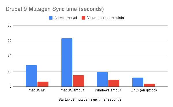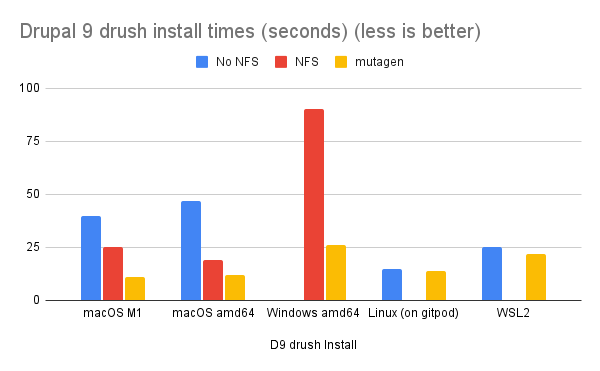 Chart depicting Drupal 9 install times without NFS, with NFS, and with Mutagen on macOS, Windows, and Linux